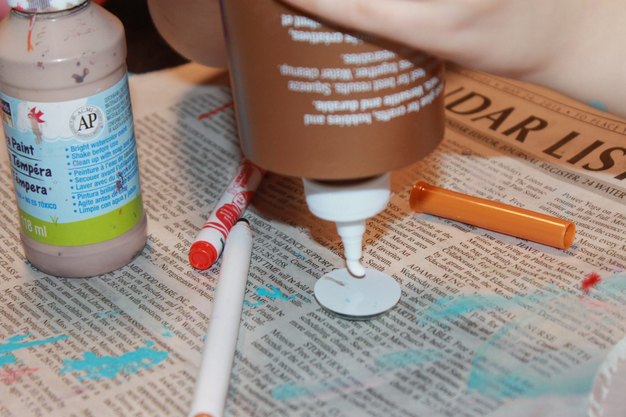 Use markers to draw in the rest of the face. Cut lengths of yarn to form the hair & glue into place however you like.