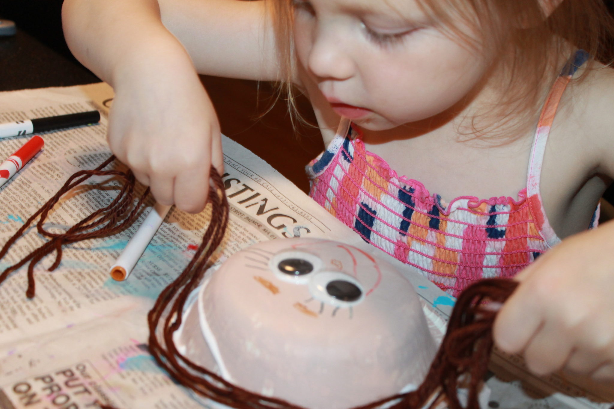 Try different hair styles with the yarn & draw in different expressions or faces. We had a lot of fun making heads. My daughter even came her girl a hair trimming to try to even out her end. Adorable!